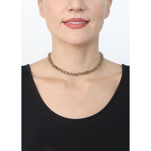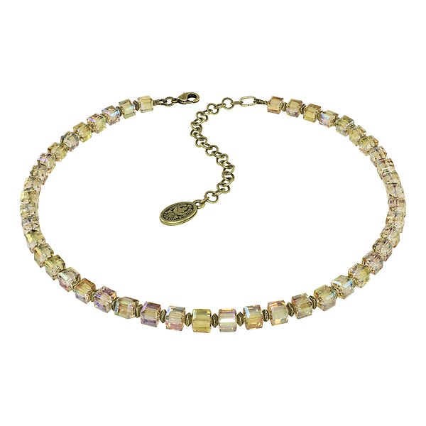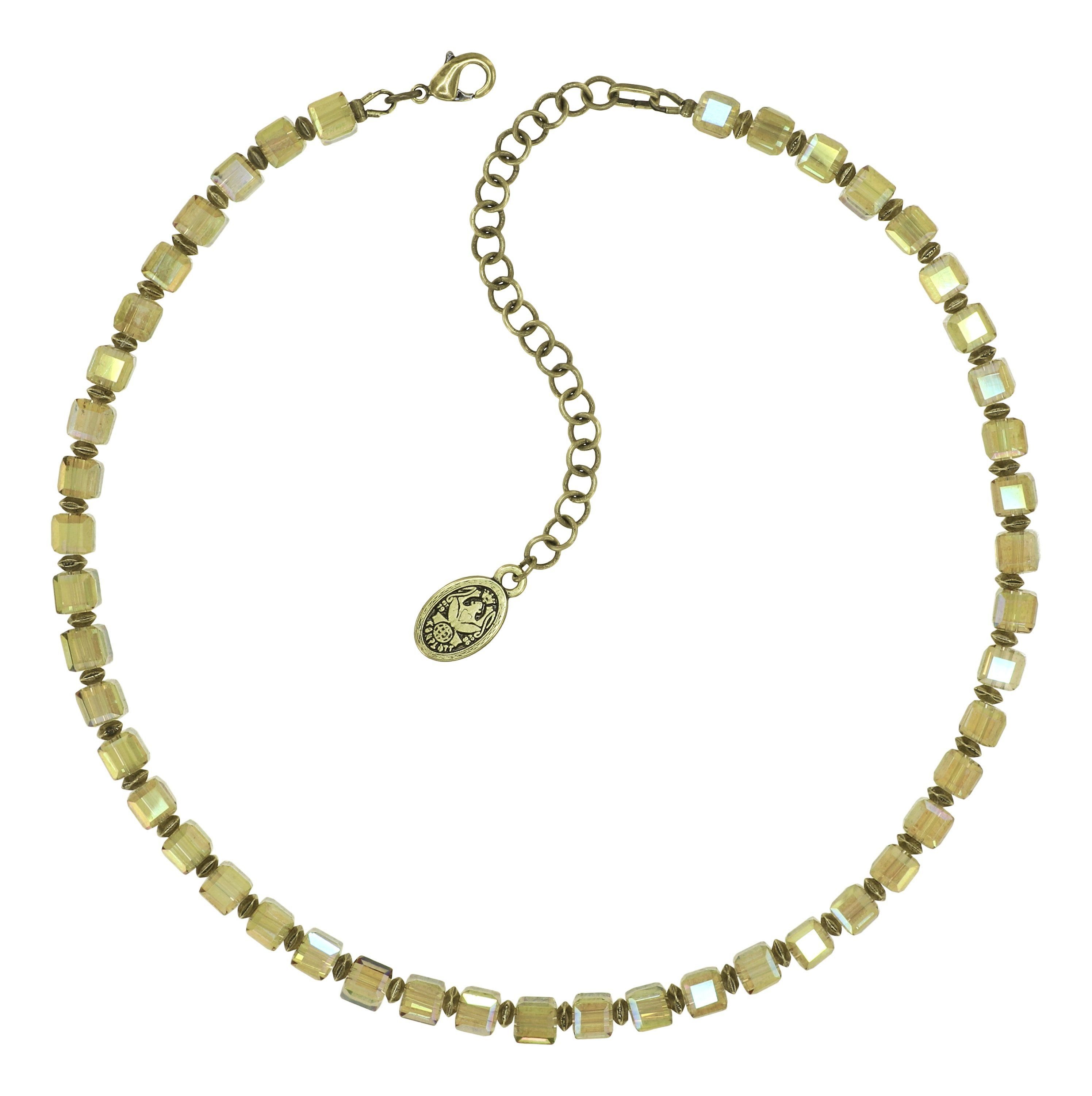 Facettierte, würfelförmige Glasperlen. Metallische Schmuckelemente.