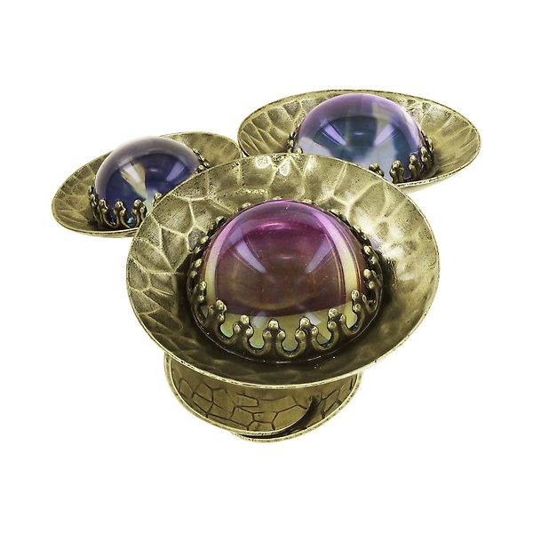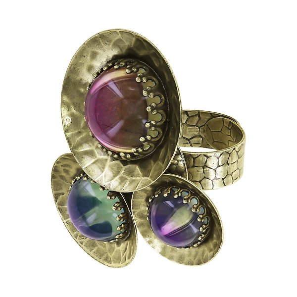 Handkolorierte Cabochons (changierend). Gehämmerte Metallscheiben.