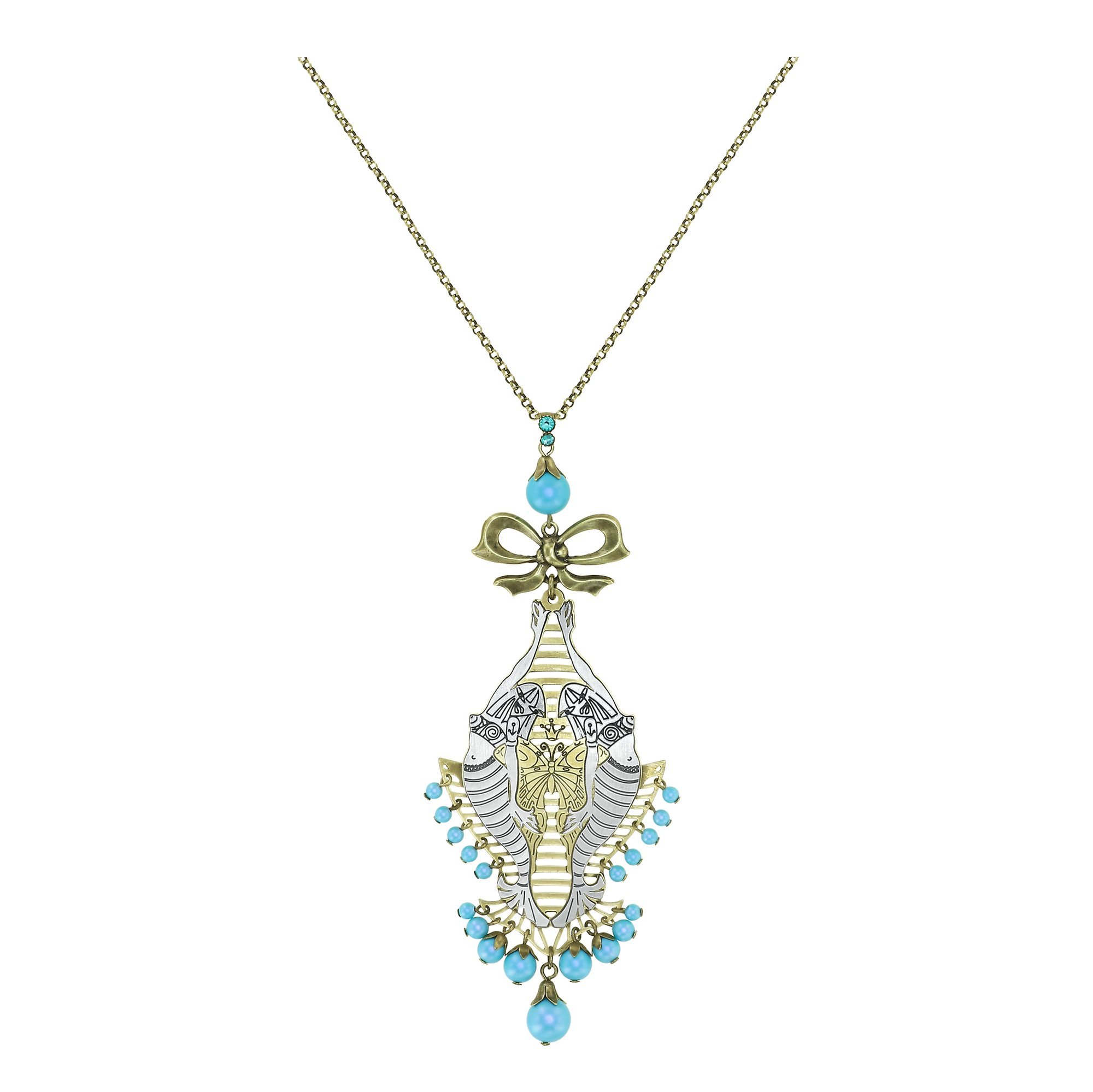 Metallisches Schmuckelement nach Zeichnungen von Miranda Konstantinidou. Beschichtete Glasperlen.